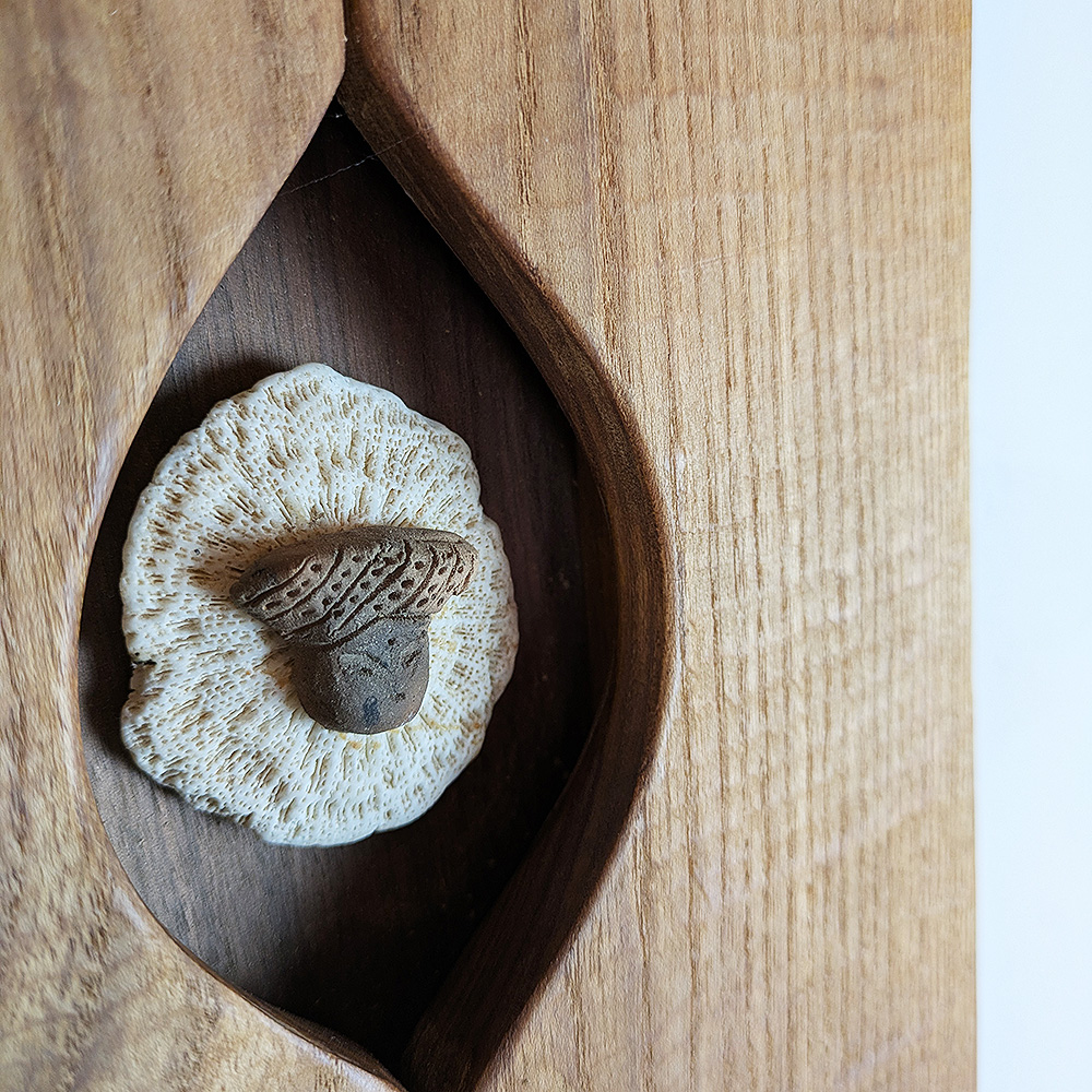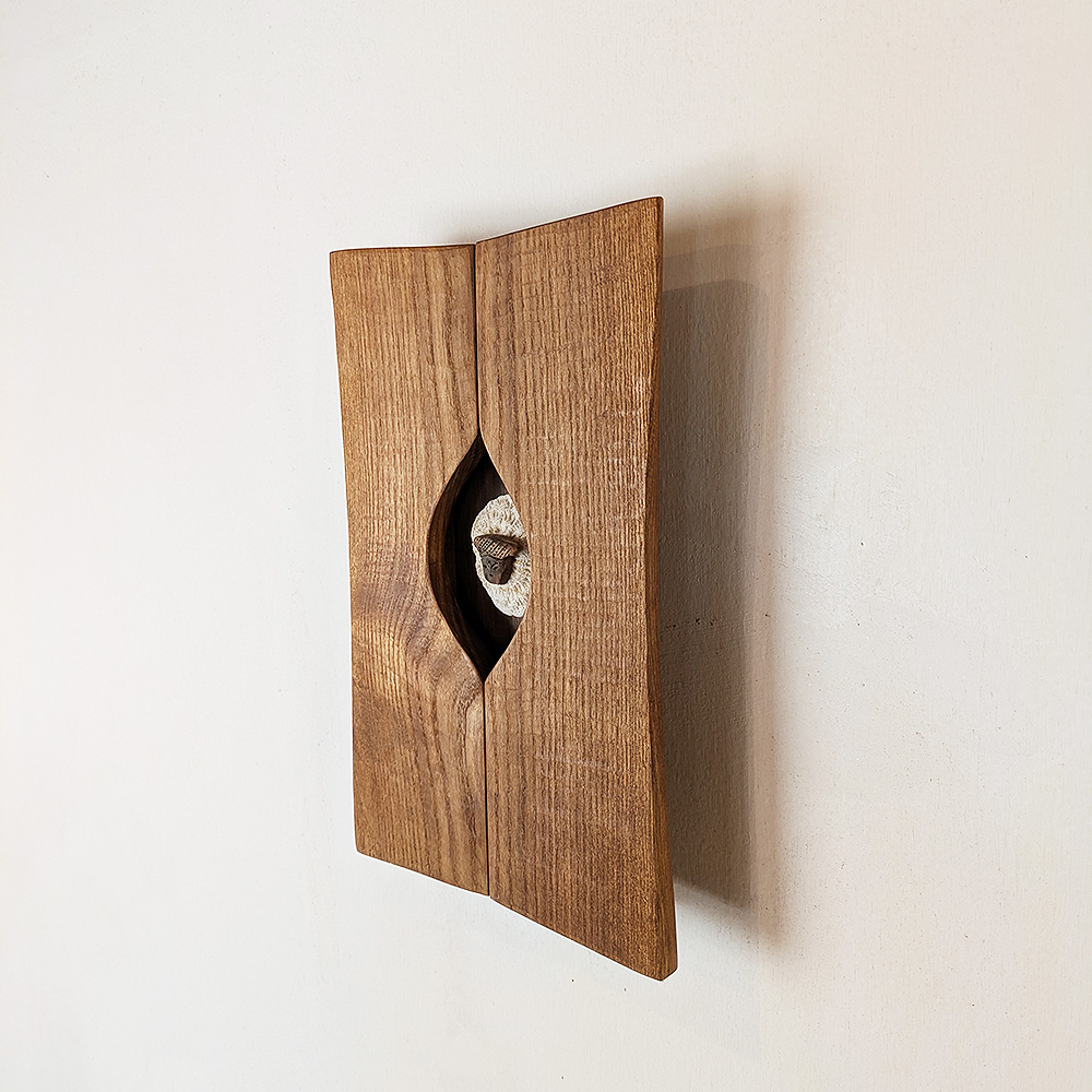 無垢材を目のかたちに切り抜き「土偶」をはめ込んだウッドパネル