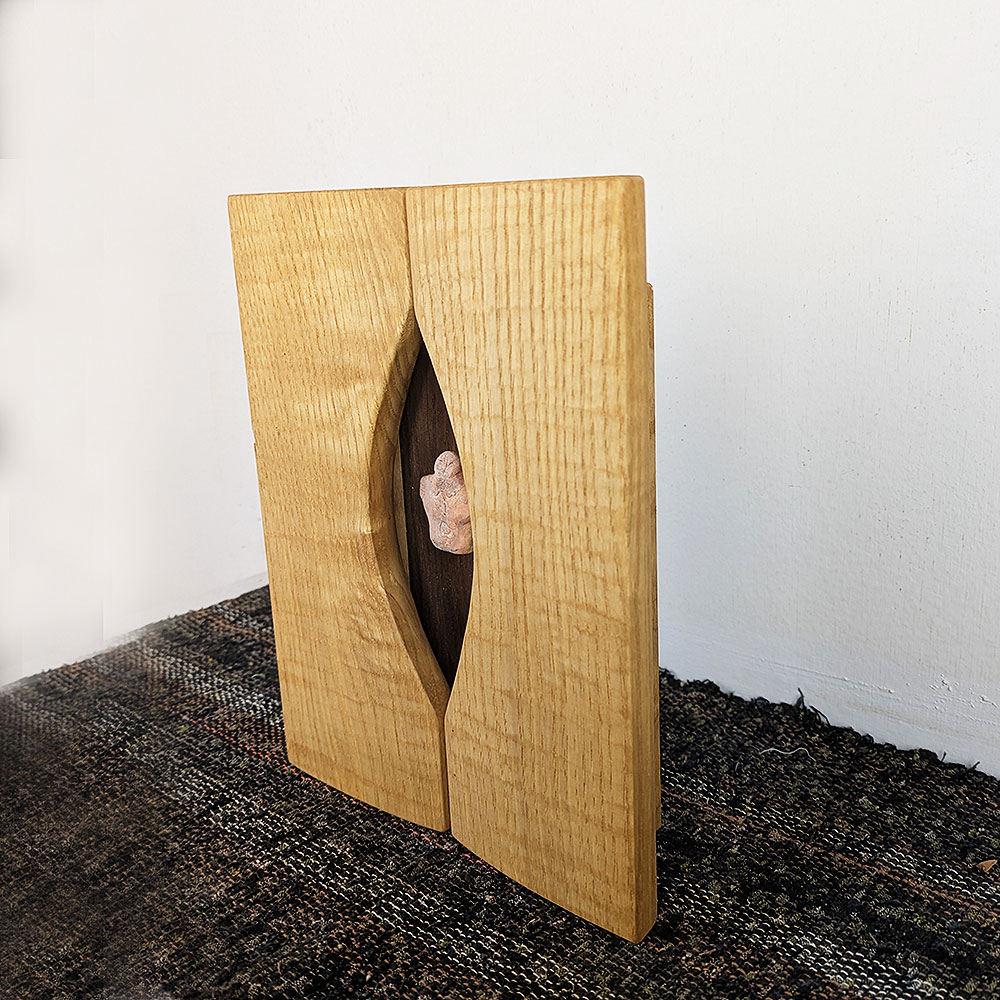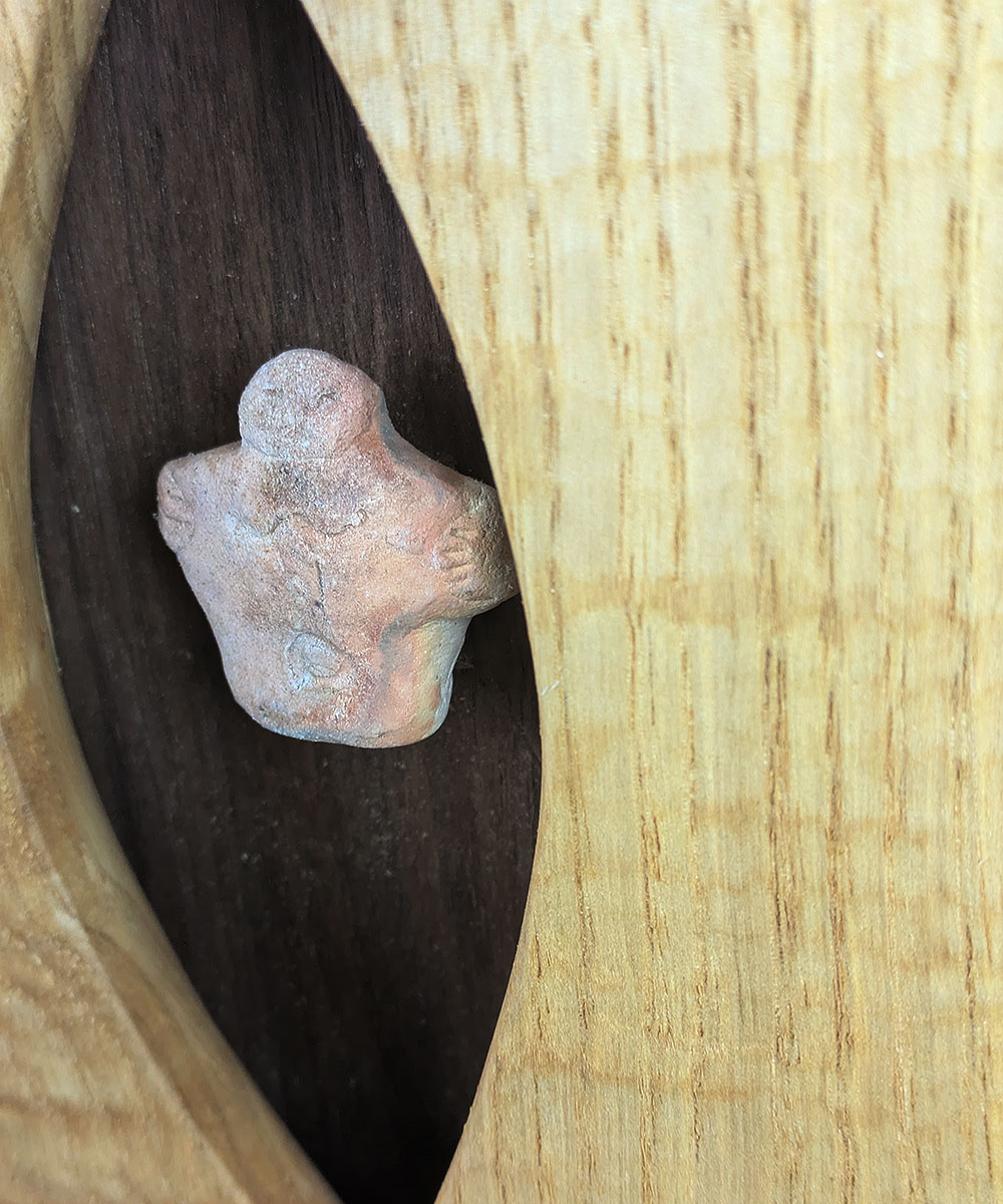無垢材を目のかたちに切り抜き「土偶」をはめ込んだウッドパネル